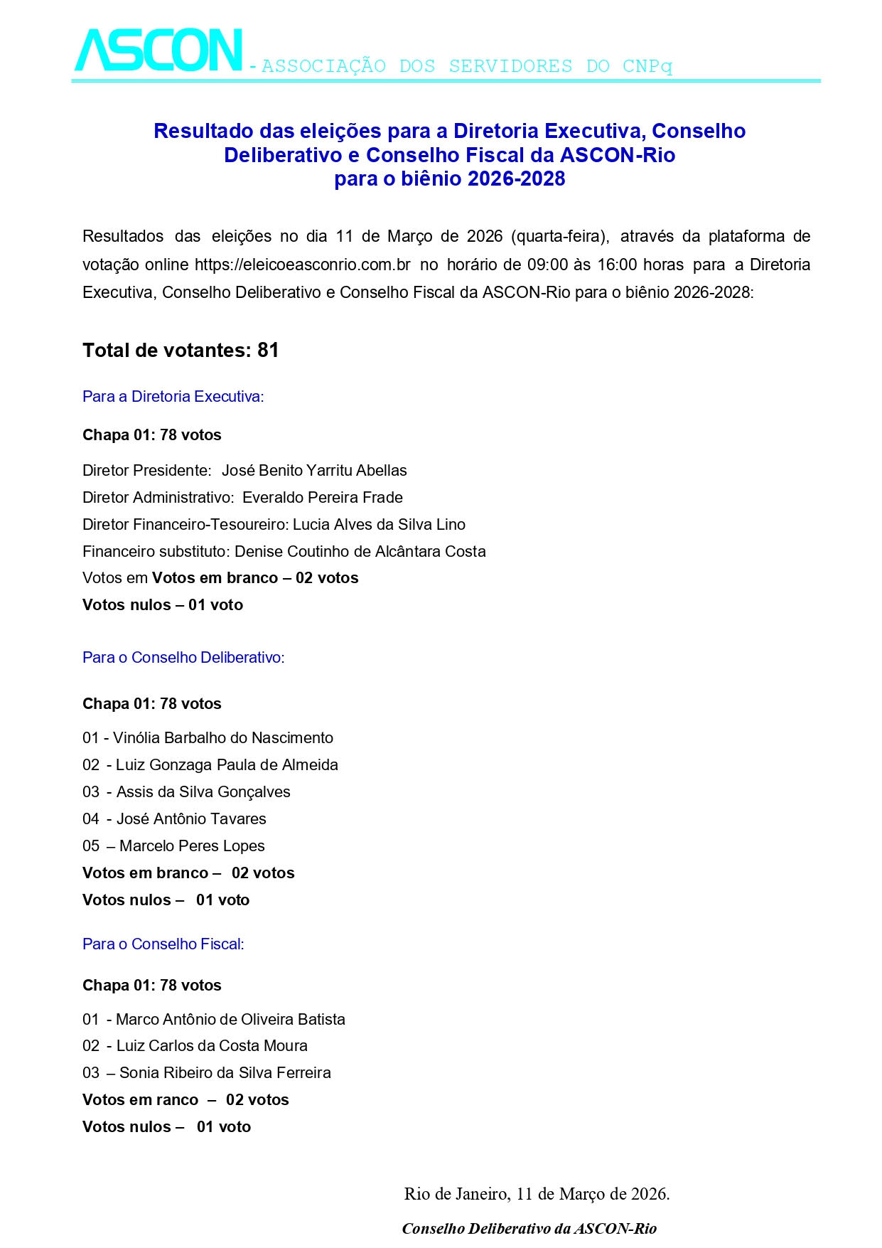 Resultados das eleições no dia 11 de Março de 2026 (quarta-feira), através da plataforma de votação online https://eleicoeasconrio.com.br no horário de 09:00 às 16:00 horas para a Diretoria Executiva, Conselho Deliberativo e Conselho Fiscal da ASCON-Rio para o biênio 2026-2028: